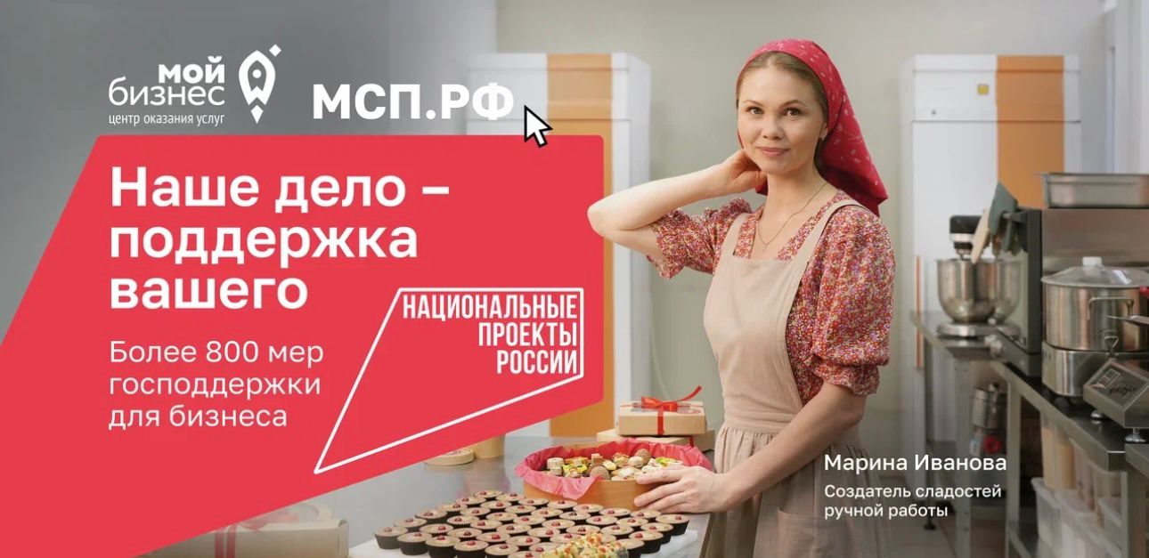 Сегодня все данные можно получить на «Госуслугах». Количество документов, которые нужны для получения лицензий, уменьшилось в два раза, а для разрешений — в 1,5 раза. Чтобы больше предпринимателей по всей стране узнали о мерах поддержки государства, стартовала федеральная рекламная кампания. Герои роликов и наружной рекламы -компании, которые воспользовались мерами поддержки по нацпроекту. Марина Иванова - предприниматель. Её бизнес «Как по маслу» начинался как маленькая семейная кондитерская, а благодаря поддержке нацпроекта «Эффективная и конкурентная экономика» стал масштабным и успешным проектом.