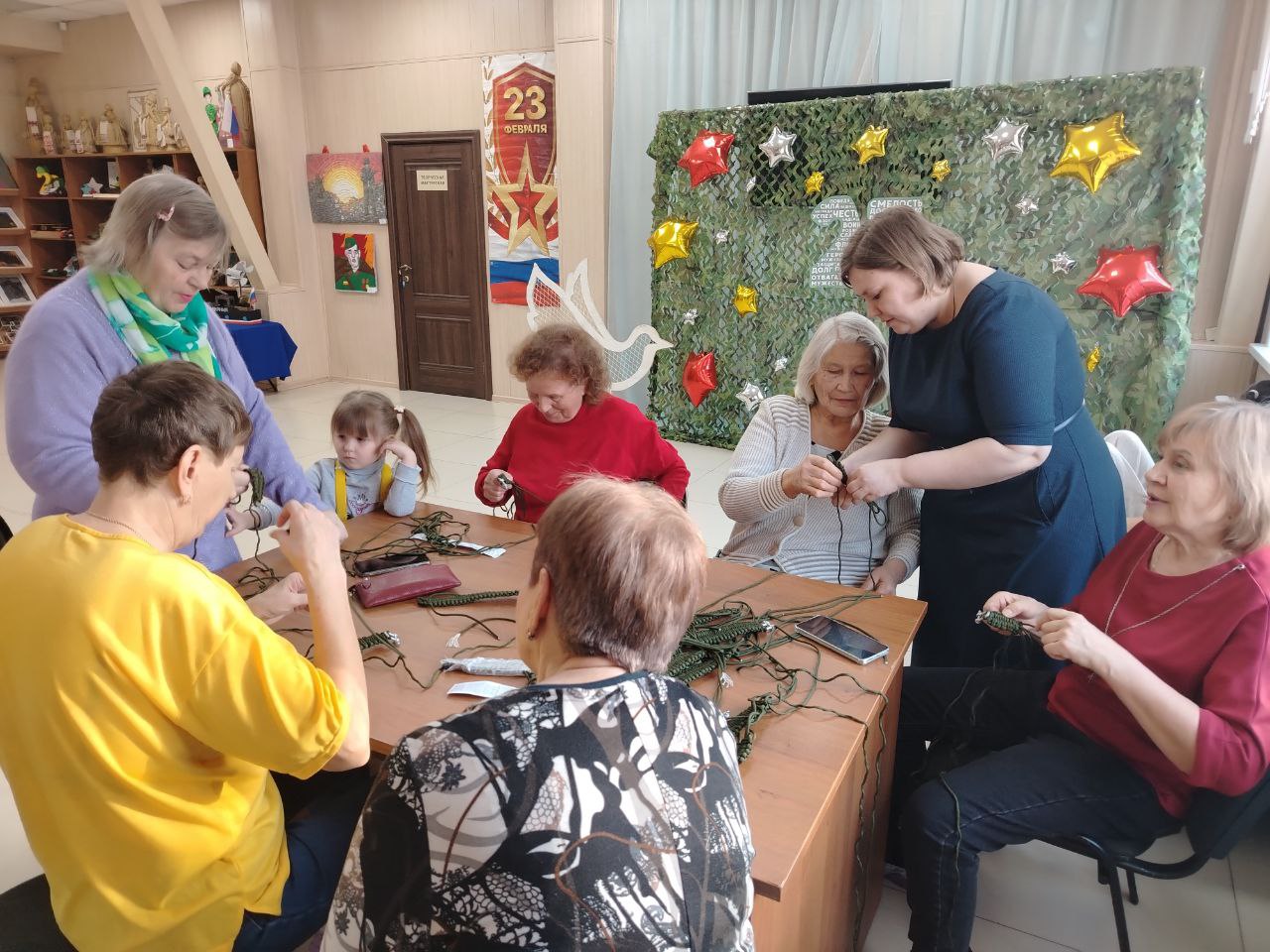 Мастер-класс плетения браслетов из паракорда «Браслет выживания» (в рамках программы Активное долголетие). Каждый присутствующий из гостей мог принять участие и при поддержке мастера студии ДПТ Екатерины Донец научиться плести важный аксессуар для солдат, которые находятся на СВО.