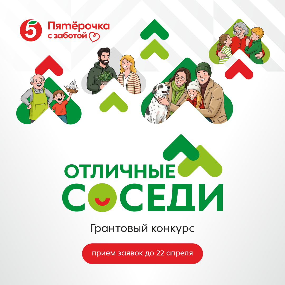 Москва, …. 2026 г. — Торговая сеть «Пятёрочка» запускает третий сезон грантового конкурса «Отличные соседи». Конкурс помогает активным жителям и организациям получить финансирование на проекты, которые объединяют семьи и соседей вокруг общих интересов, полезных дел и взаимопомощи. Общий грантовый фонд — 6 миллионов рублей.