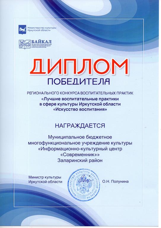 Награждение победителей прошло на заседании Координационного совета руководителей органов управления культурой муниципальных образований Иркутской области 15 декабря 2025 года на Малой сцене Иркутского областного музыкального театра имени Н.М.Загурского. С докладом о проделанной работе выступила руководитель клубного формирования ИКЦ «Современник» Юлия Юрьевна Алищугова, осветив эту важную работу учреждения культуры, реализованную в 2025 году, ориентированную на духовно-нравственное, патриотическое воспитание детей и молодежи.